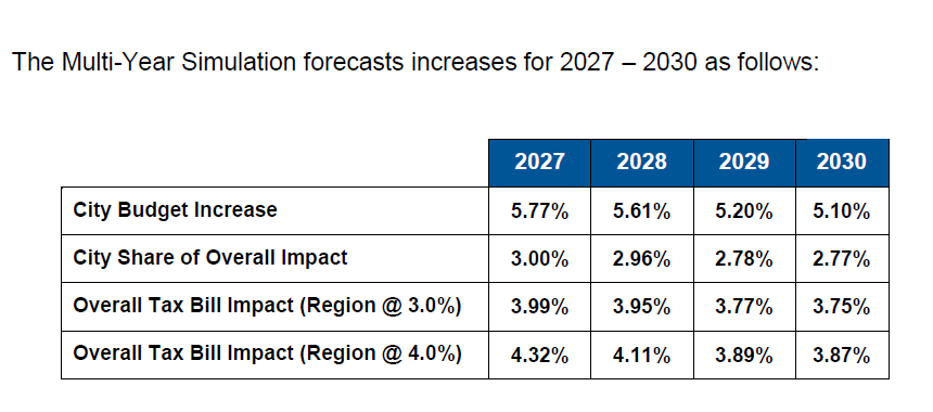 To prepare the budget, the city uses a five-year simulation to identify “major budget drivers and expected future tax rate impacts.”