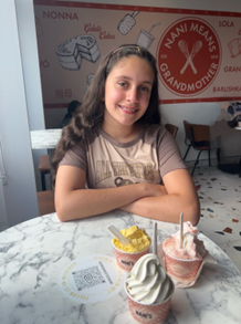 A refreshing picture featuring: Salma Menhel (our younger sister who gladly volunteered to contribute to this part of the research), double strawberry and mango passionfruit gelato scoops, and matcha and vanilla bean twist soft serve.