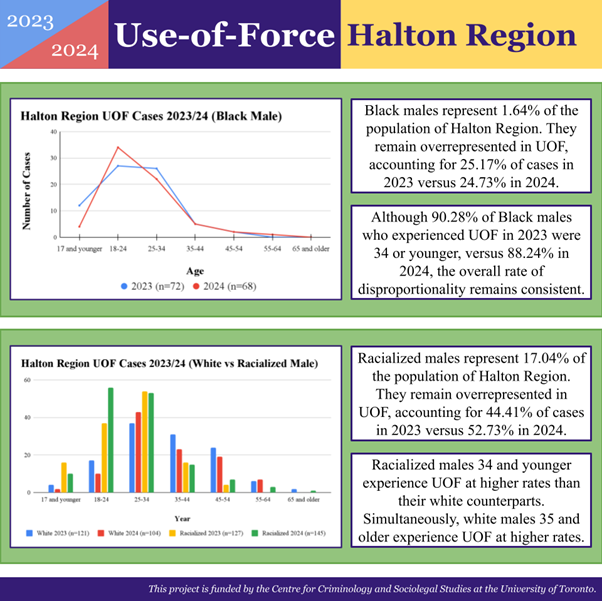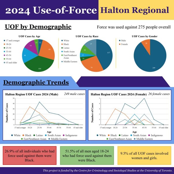 The data also show that young Black men are disproportionately affected. In 2023, 90.3% of Black males who experienced use of force were 34 years old or younger. In 2024, that figure was 88.2%. Across racial lines, racialized males aged 34 and under experienced use of force at higher rates than their white counterparts. Overall, 27.7% of all individuals subjected to police use of force in Halton were Black.