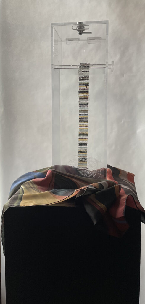 “beadSpitter is essentially a piece with a belt, which signifies my agreement with the lake to protect it,” Tammaro said. It is encased in a vitrine, which contains lake water and wampum beads.