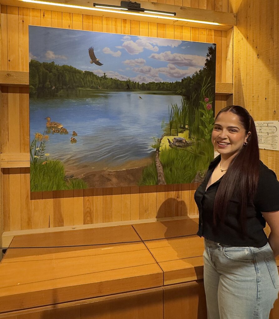 “I made my family come out with me to go get reference photos to start my work,” Sandy said. “We just did our usual go around the trail, and I got my shot. I wanted a timeless piece that shows how iconic Crawford Lake is. I think what makes Crawford Lake iconic is the water and all the animals around it, in the water, on the land, and in the sky.”