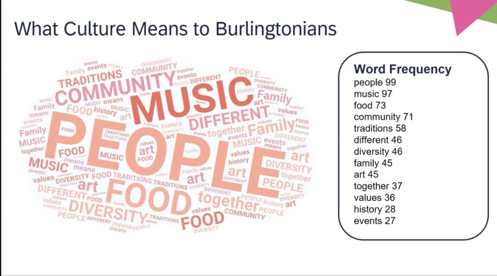 According to the city, over 1748 people participated in Culture Plan community engagement, or 0.93% of Burlington’s population.