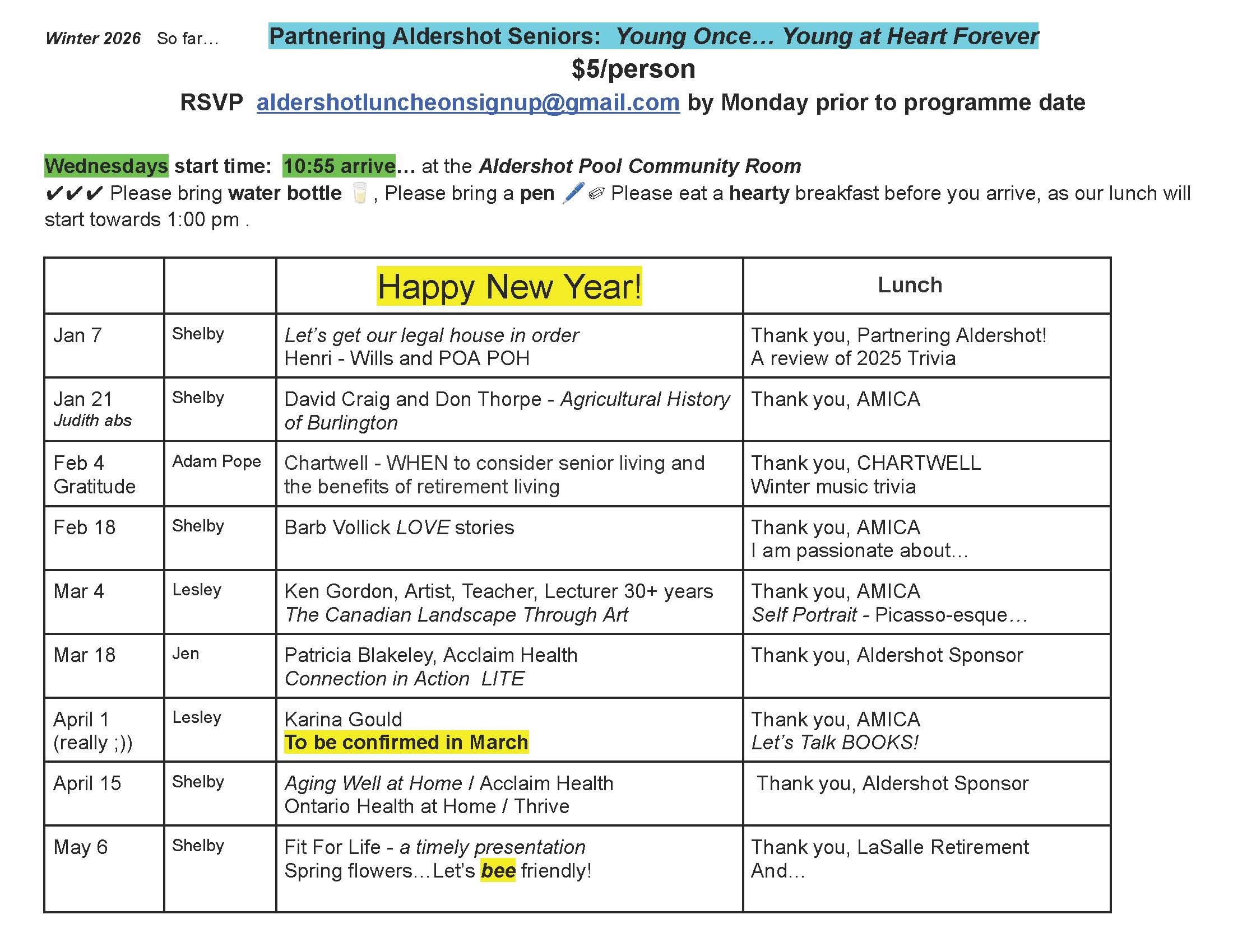 If you are interested in attending any of the Sessions, please be sure to RSVP to AldershotLuncheonSignUp@gmail.com by noon the Monday before they can plan to have enough lunches.
